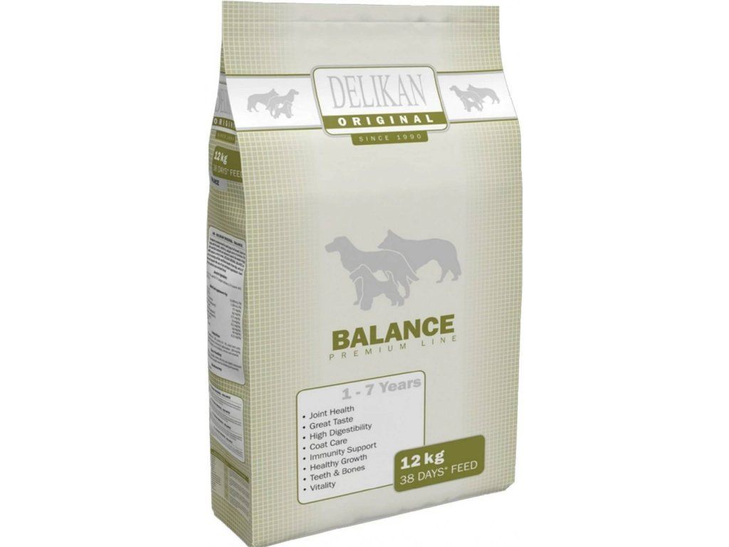DELlKAN Original Balance je kompletní prémiové krmivo pro dospělé psy všech plemen, složené pro psy s běžnou aktivitou. Obsahuje 28 % dehydrovaného drůbežího masa, 23 % bílkovin a 11 % tuku, dále glukosamin (200 mg/kg) a chondroitin (150 mg/kg) pro podporu kloubů. Receptura neobsahuje sóju, chemické konzervanty ani umělá barviva a doplňuje ji vláknina z řepné dužiny a přírodní složky jako sušená jablka a rozmarýnový olej.