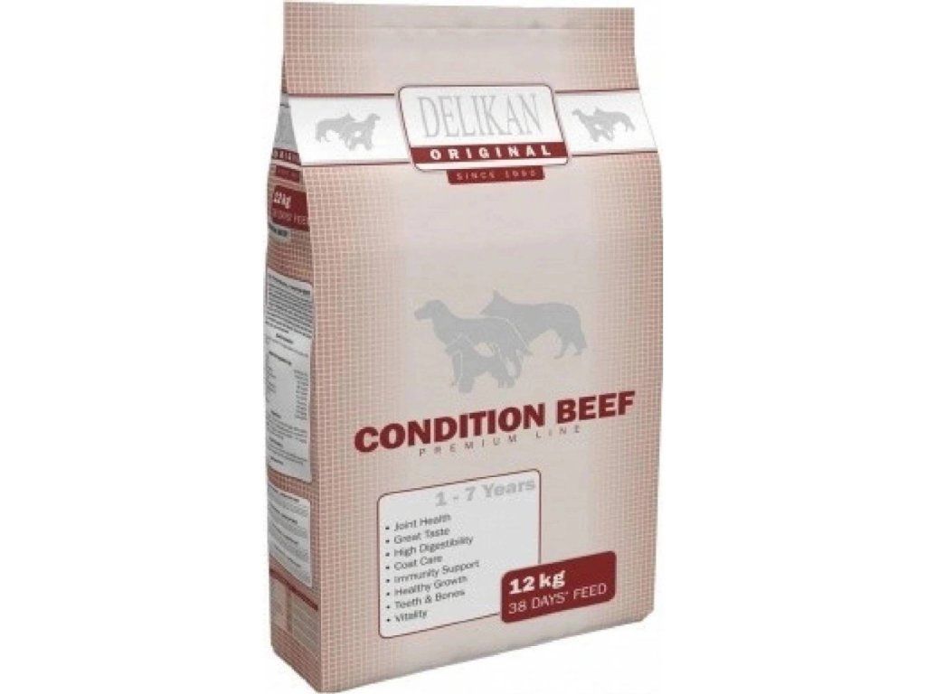 Delikan Dog Original Condition Beef 12 kg je superprémiové suché krmivo pro dospělé psy všech plemen, založené na až 42 % hovězího masa a vyvážené sacharidové složce. Receptura obsahuje probiotika, Salmon Pro (výtažek z mořských ryb) pro omega‑3 a kombinaci glukosaminu a chondroitinu (>500 mg/kg) pro podporu kloubů; krmivo neobsahuje pšenici, kukuřici, sóju ani vepřové maso a přechod doporučujeme postupně 4–7 dní.